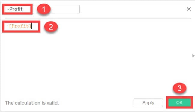 - 将计算字段的名称输入为“-Profit”。