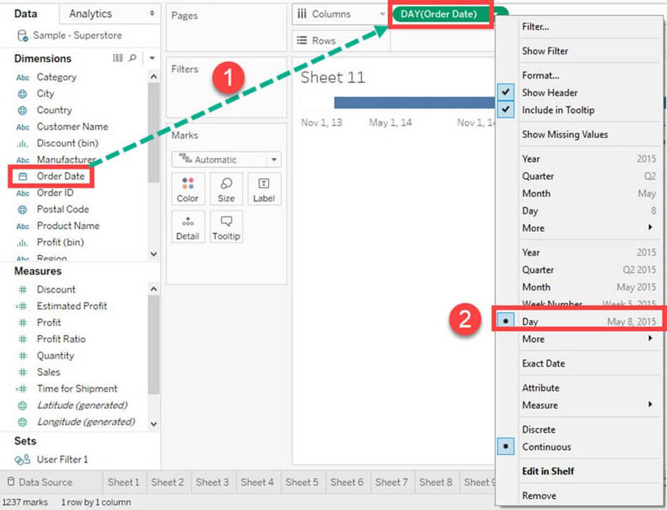 - 右键单击“订单日期”,然后选择图像中显示的“日”。