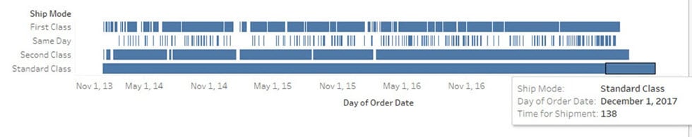 甘特图可以显示类别之间的数据比较。它可用于识别每个过程所需的时间。在下面的示例中,给出了每种货运方式的装运时间。创建甘特图的过程如下。