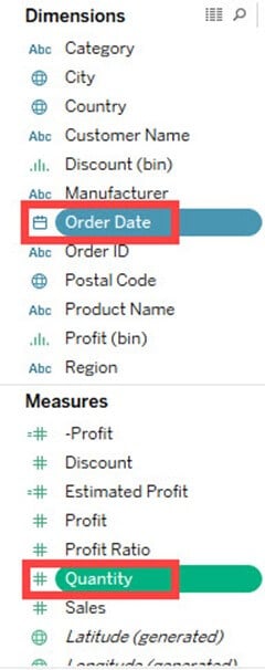 - 按住键盘上的 Ctrl 键,然后选择“订单日期”和“数量”。