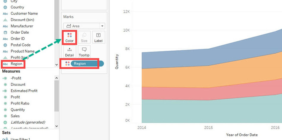 - 将“区域”从维度窗格拖到标记卡的颜色图标中。