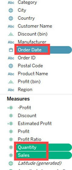 - 按住 Ctrl 键并选择“订单日期”、“销售额”和“数量”。