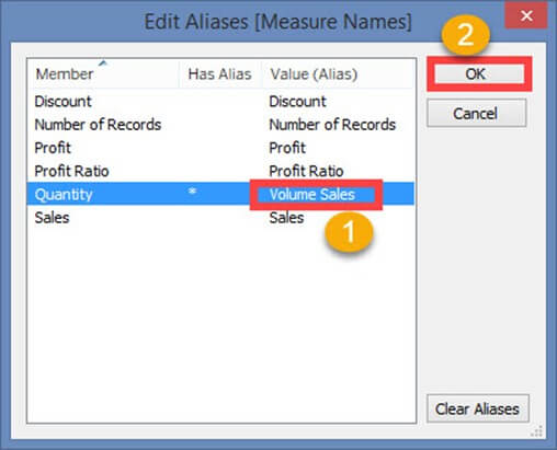 - 编辑成员的别名。在此示例中,“数量”被赋予了“销量”的别名。