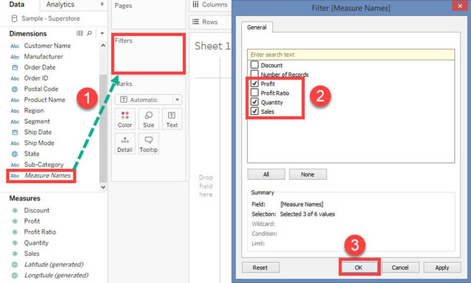 - 勾选除“利润”、“数量”和“销售额”之外的所有度量。
