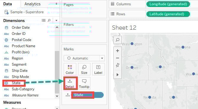 - 将“State”(州)拖到“Marks card”(标记卡)中的“Detail”(详细信息)图标。