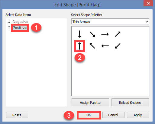 步骤 3)将新创建的计算字段“Profit Flag”拖到“Marks card”(标记卡)中的“Shape”(形状)图标。