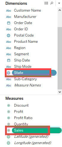 - 按住 Control 键,然后单击数据窗格中的“State”(州)和“Sales”(销售额)。