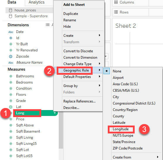 - 单击数据集中可用的“Longitude”(经度)选项。此步骤用于分配所选列的地理角色。