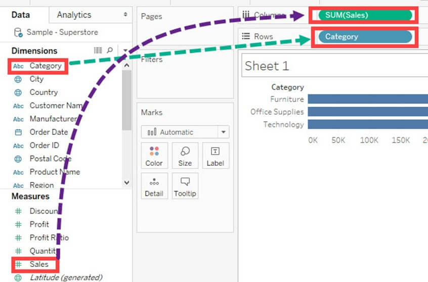 步骤 1)转到工作表,并按图像所示拖动一个维度和一个度量。