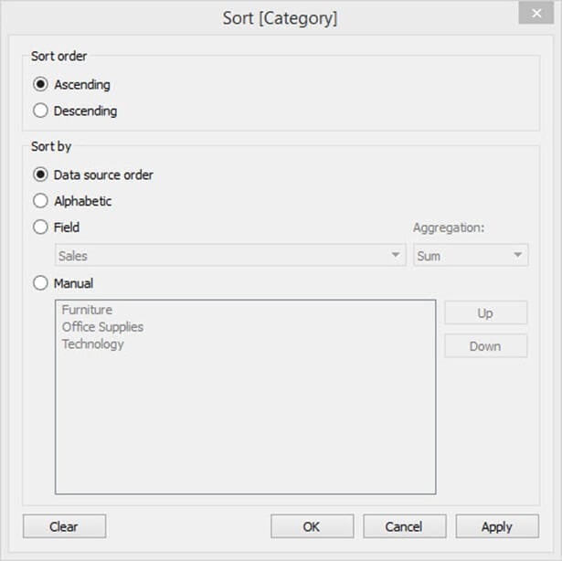| 手动 | 用户可以使用此选项手动排序数据。 |