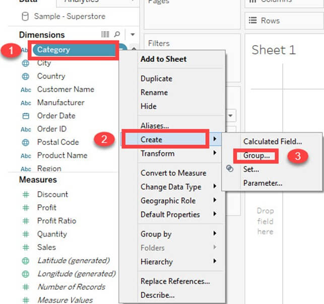 - 可以构建 Tableau 组来对维度中的成员进行分组。