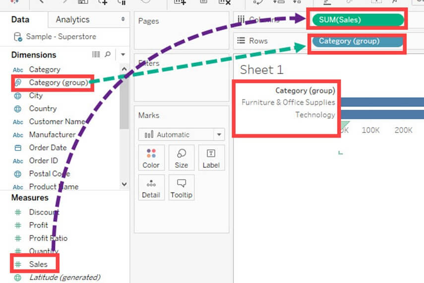 组用于组合字段中的成员。例如,可以使用组获得“Furniture”和“Office Supplies”的聚合值。在 Tableau 中完成分组数据后,可以在可视化中显示“Furniture”和“Office Supplies”的聚合值。Tableau 中数据分组的步骤如下。