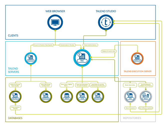 客户端模块包括一个或多个 Talend Studio 和 Web 浏览器,它们可以使用相同或不同的机器。Talend Studio 允许您执行数据集成过程,无论数据量和过程复杂性如何。