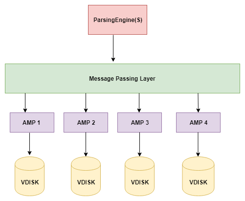 因此,当客户端执行插入记录的查询时,解析引擎会将记录发送到消息传递层。消息传递层或 BYNET 是一个软硬件组件。它提供网络功能。它还检索记录并将行发送到目标 AMP。