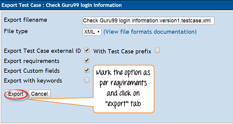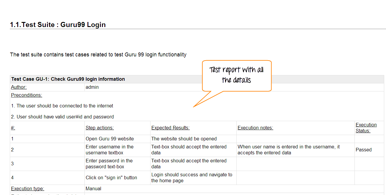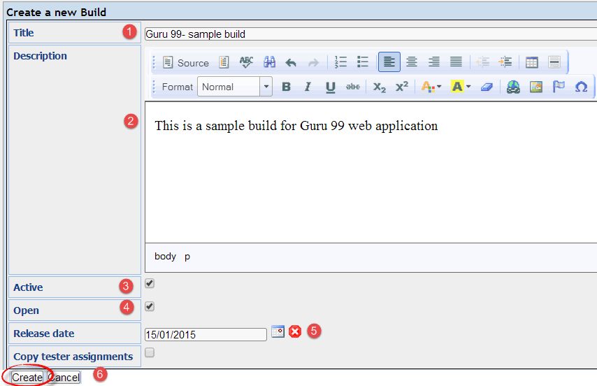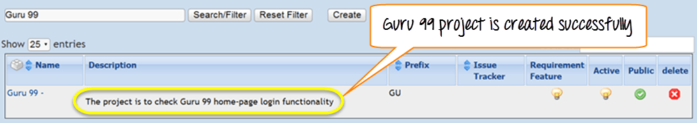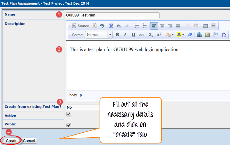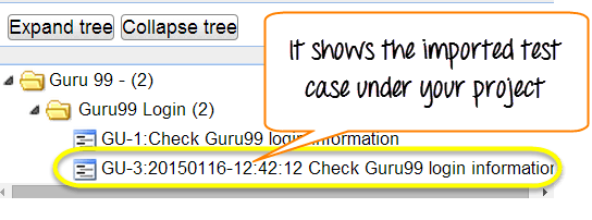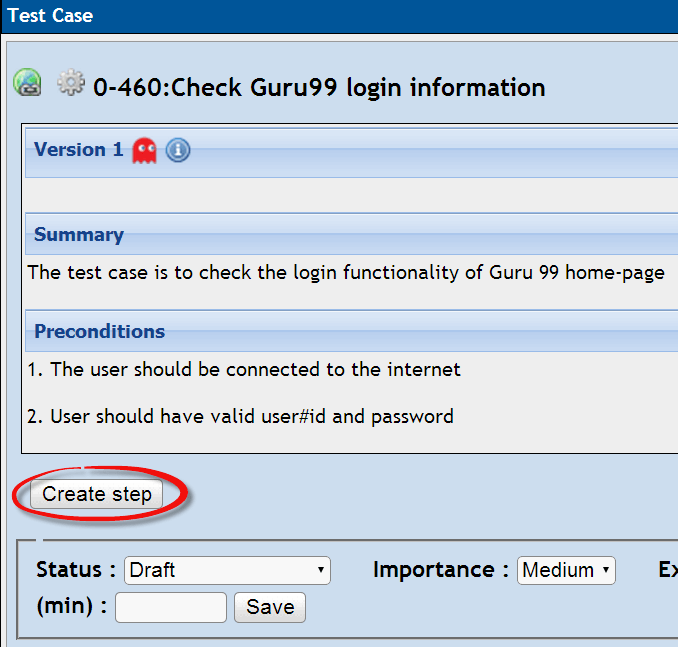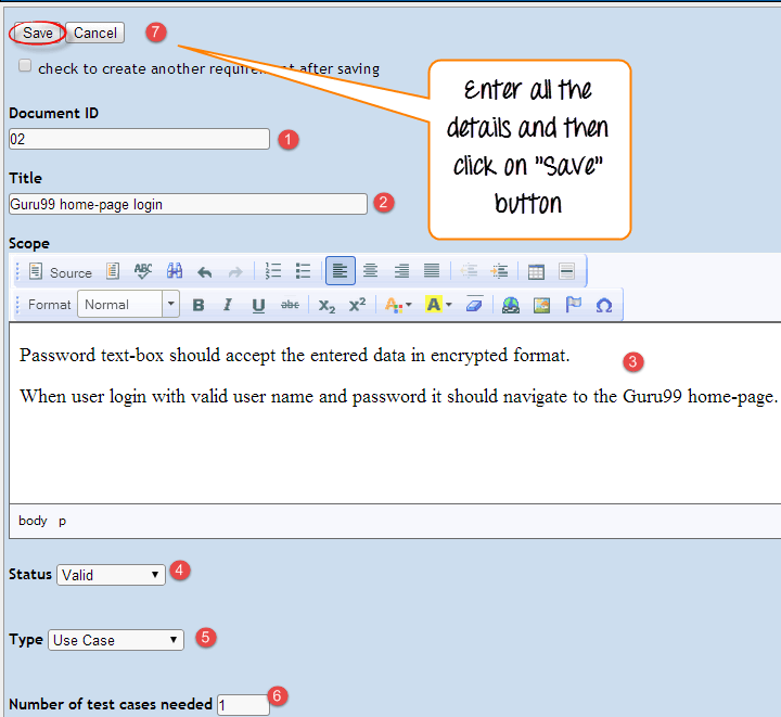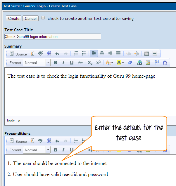 步骤 5: 输入详细信息后,点击“创建”按钮保存详细信息。Guru99 的测试用例已成功创建