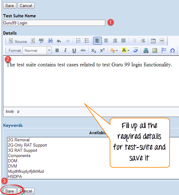 步骤 4: 填写测试套件的所有详细信息,然后点击保存选项卡。