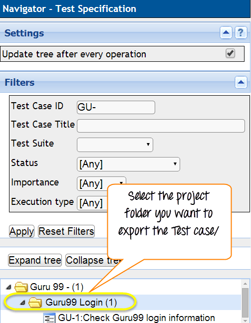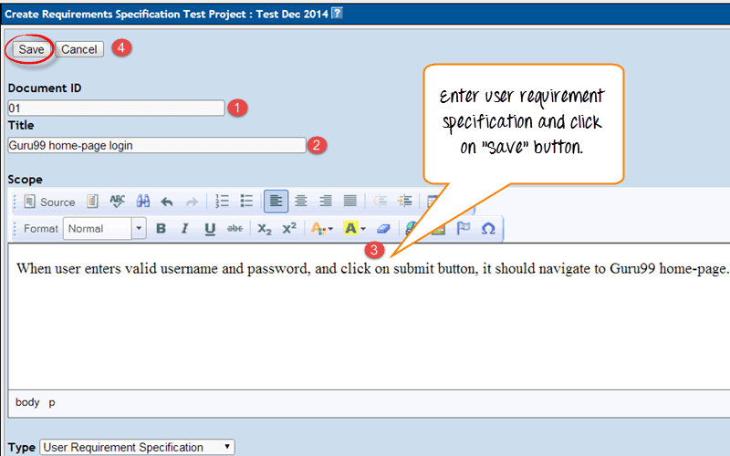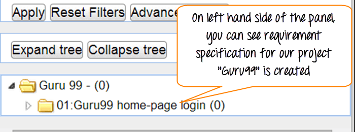 步骤 4:它应创建需求规范,并显示在项目“Guru99”下的左侧面板中。