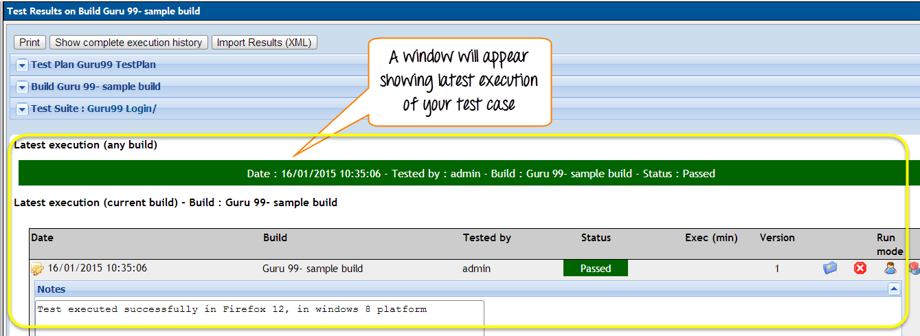 在 TestLink 中,我们可以运行测试用例并更改测试用例的执行状态。测试用例的状态可以设置为“阻塞”、“通过”或“失败”。最初,它会处于“未运行”状态,但一旦您更新了它,就不能再改回“未运行”状态。