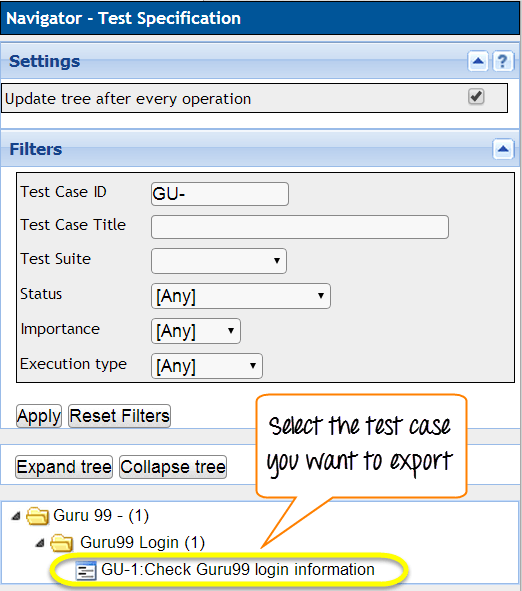 步骤 1:在测试规范页面中选择您想要导出的测试用例
