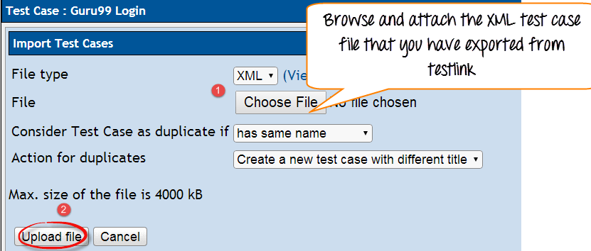 步骤 4: 浏览并附加您从 Test link 导出的 XML 测试用例文件,然后点击上传按钮。