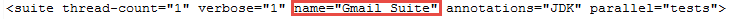 <suite thread-count="1" verbose="1" name="Gmail Suite" annotations="JDK" parallel="tests">