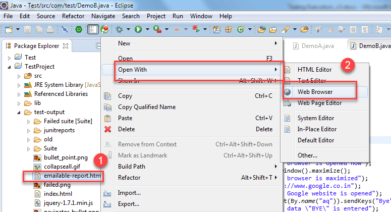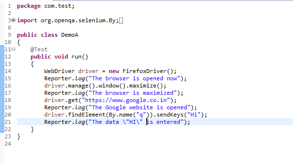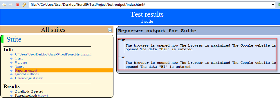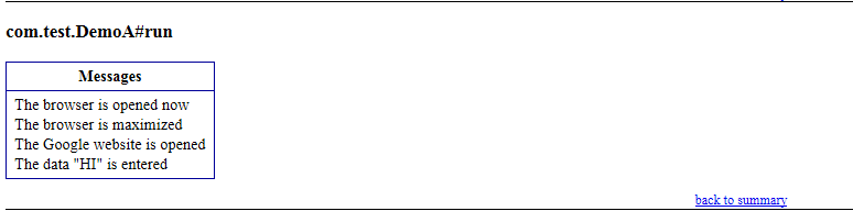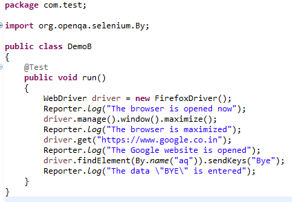 - DemoA 的代码已在上面解释。这里您使用的是 Reporter 类的 log 方法。 (要实现报告类,该类必须实现 org.testng.IReporter 接口)。