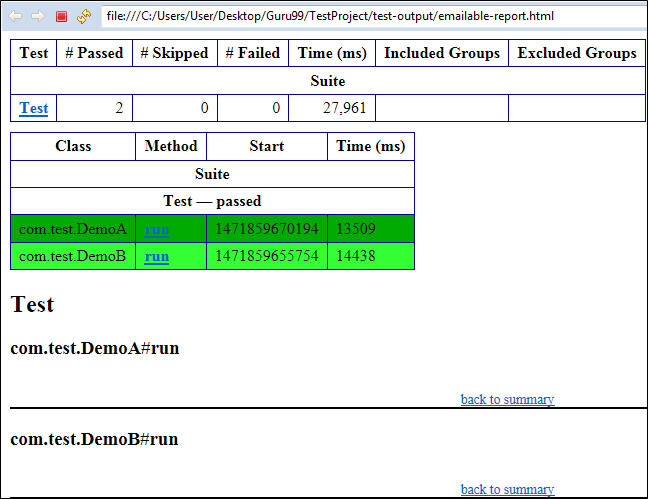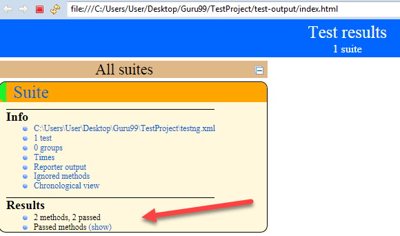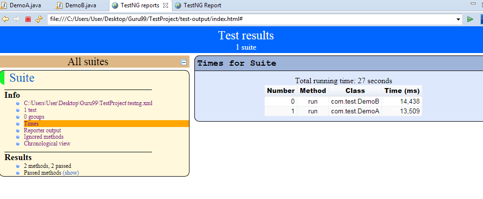 如果两个类都通过,TestNG 报告中的输出报告将如下所示