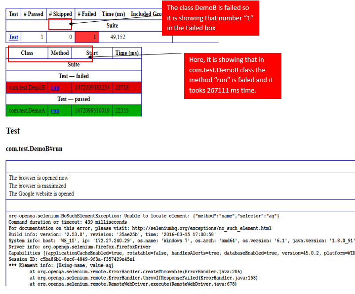 考虑以下场景,您故意使测试用例失败,即 DemoB 类。然后将这两个类转换为 testng.xml 套件文件并运行。然后结果将如下所示。它将显示失败的测试用例。