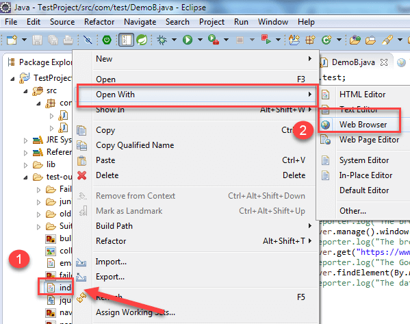 - 当您执行 testng.xml 文件并刷新项目时。您将在该文件夹中获得 test-output 文件夹,用于 TestNG 中的报告。