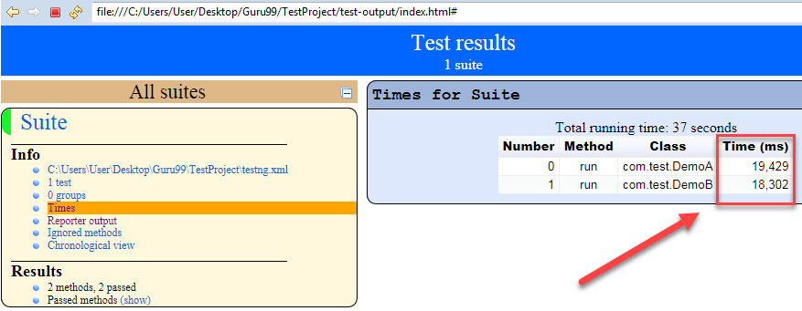 点击“时间”。它将显示使用 TestNG 报告工具运行类中存在的测试方法所需的时间。