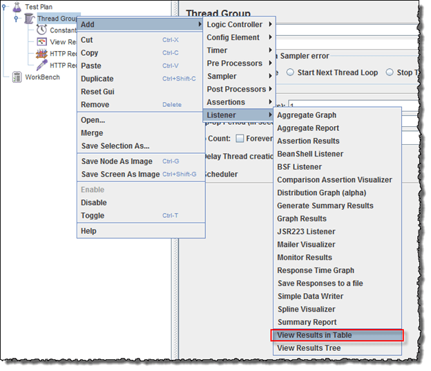 右键单击**添加** -> 监听器 ->在表格中查看结果