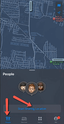 步骤 1)启动“查找”App,转到“人物”选项卡,然后点击“开始共享位置”。