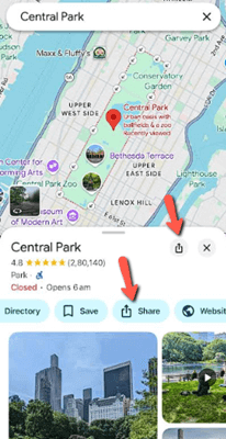 步骤 3)如果您想从 Google 地图发送位置,请打开该 App。现在,选择您的位置,然后点击标准的共享图标,它看起来像一个带箭头的框。