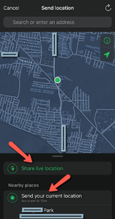 步骤 2)点击“位置”后,选择“发送实时位置”或“发送您的当前位置”。您还可以从“附近地点”选项中选择一个地标。
