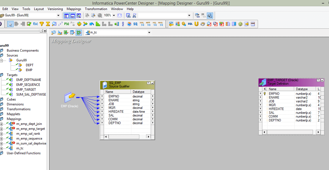 步骤 1) 创建一个以 EMP 为源,EMP_TARGET 为目标的映射。