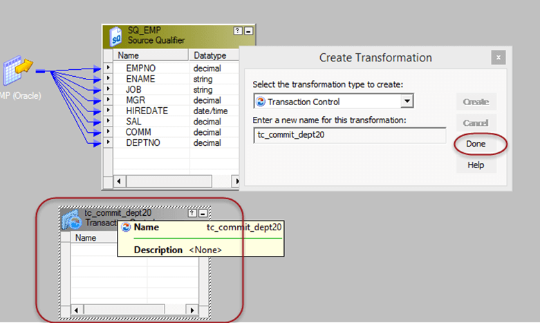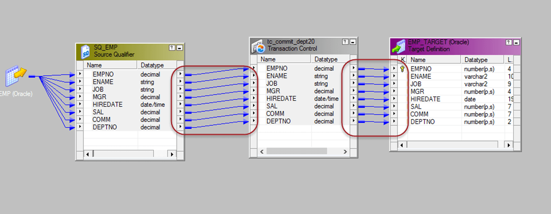 步骤 4) 将所有列从源限定符拖放到事务控制转换,然后将所有列从事务控制转换链接到目标表。