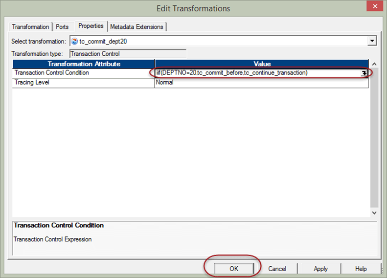 “iif(deptno=20,tc_commit_before,tc_continue_transaction)” 并选择确定。
