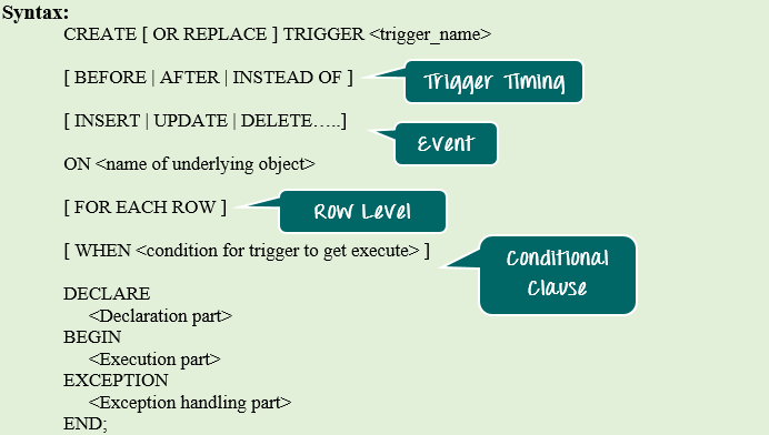 CREATE [ OR REPLACE ] TRIGGER <trigger_name> [BEFORE | AFTER | INSTEAD OF ] [INSERT | UPDATE | DELETE......] ON<name of underlying object> [FOR EACH ROW] [WHEN<condition for trigger to get execute> ] DECLARE <Declaration part> BEGIN <Execution part> EXCEPTION <Exception handling part> END;