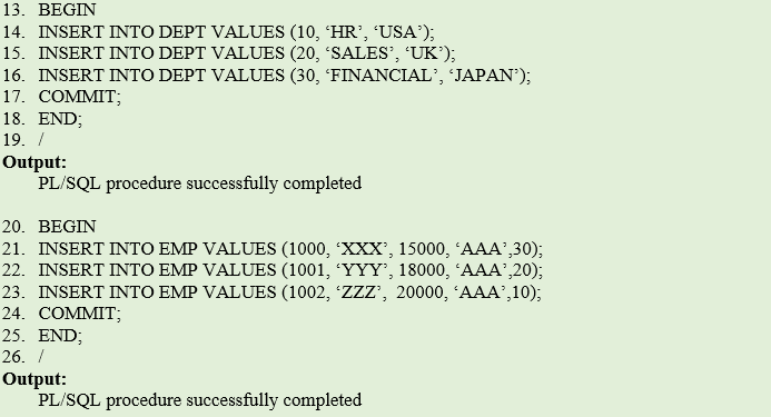 BEGIN INSERT INTO DEPT VALUES(10,‘HR’,‘USA’); INSERT INTO DEPT VALUES(20,'SALES','UK’); INSERT INTO DEPT VALUES(30,‘FINANCIAL',‘JAPAN'); COMMIT; END; / BEGIN INSERT INTO EMP VALUES(1000,'XXX5,15000,'AAA',30); INSERT INTO EMP VALUES(1001,‘YYY5,18000,‘AAA’,20) ; INSERT INTO EMP VALUES(1002,‘ZZZ5,20000,‘AAA',10); COMMIT; END; /