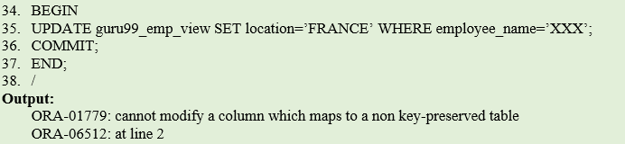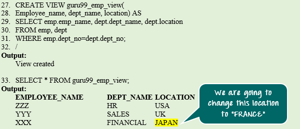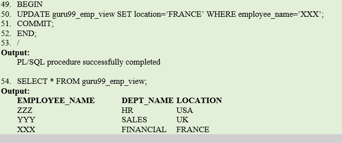 BEGIN UPDATE guru99_emp_view SET location='FRANCE' WHERE employee_name=:'XXX’; COMMIT; END; /