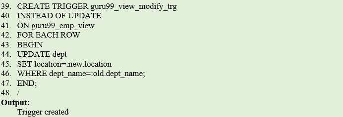 CREATE TRIGGER guru99_view_modify_trg INSTEAD OF UPDATE ON guru99_emp_view FOR EACH ROW BEGIN UPDATE dept SET location=:new.location WHERE dept_name=:old.dept_name; END; /