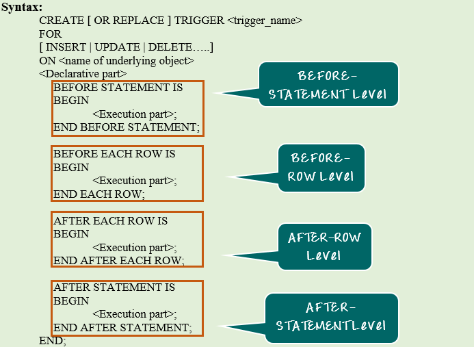 CREATE [ OR REPLACE ] TRIGGER <trigger_name> FOR [INSERT | UPDATE | DELET.......] ON <name of underlying object> <Declarative part> BEFORE STATEMENT IS BEGIN <Execution part>; END BEFORE STATEMENT; BEFORE EACH ROW IS BEGIN <Execution part>; END EACH ROW; AFTER EACH ROW IS BEGIN <Execution part>; END AFTER EACH ROW; AFTER STATEMENT IS BEGIN <Execution part>; END AFTER STATEMENT; END;