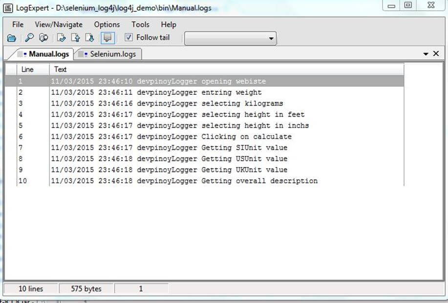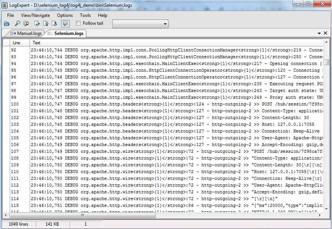 使用 LogExpert 工具,可以调试 Selenium WebDriver 创建的日志,因为在此工具中可以