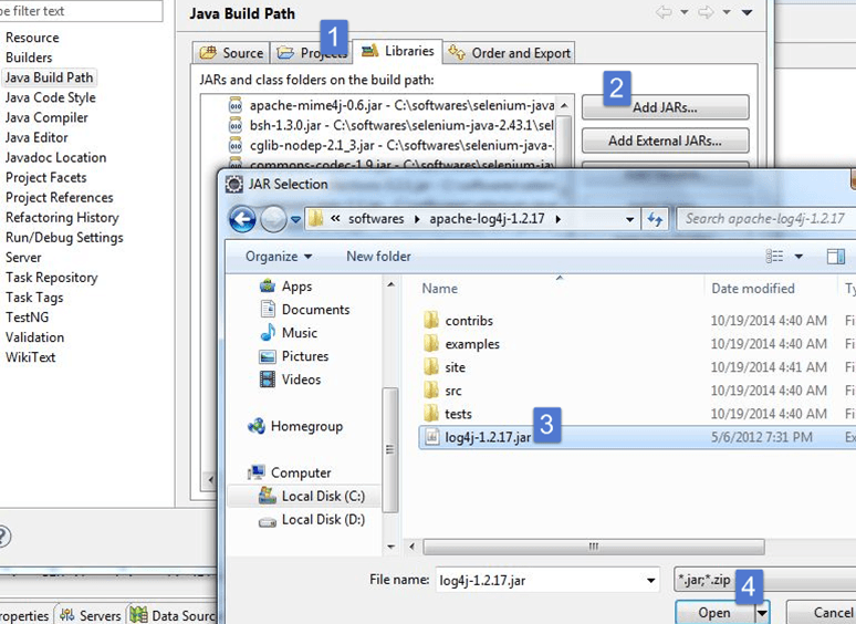 步骤 3) 单击 Libraries 并添加 Log4J 库。您可以从 https://logging.apache.ac.cn/log4j/1.2/download.html 下载