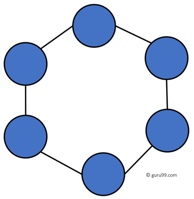 在环形网络中,每个设备都有两个相邻的设备用于通信。由于其形成方式类似于环,因此称为环形拓扑。在此拓扑中,每台计算机都连接到另一台计算机。最后一个节点与第一个节点连接。
