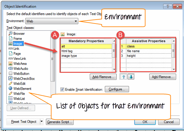 要访问,请在 QTP 的“工具”菜单中选择“对象识别”。在“对象识别”对话框中,您可以看到所有已安装和加载的环境的下拉列表。