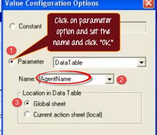 “值配置”对话框打开。目前,该值设置为常量。单击“参数”单选按钮。QTP 为此参数分配一个默认名称。您可以输入您选择的名称,然后单击“确定”。