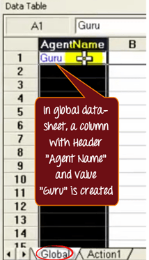 在全局工作表中,创建了一个名为“Agent Name”的列,其值为 Guru。您可以为此参数输入更多值。