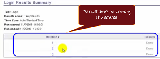 这个数据表意味着 QTP 将迭代我们已经录制的三次相同的六个步骤。在第一次迭代期间,它将使用第一行中的数据。在第二次迭代期间,它将使用第二行中的数据,依此类推。现在让我们运行脚本。这是第一次迭代。这是第二次迭代。**在状态栏中,QTP 提供有关其当前用作测试数据行的信息**,并突出显示数据表中的相应行。结果将显示 3 次迭代的摘要。