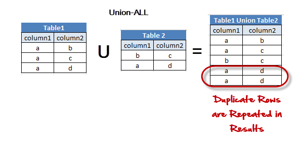 此处会包含重复行,因为我们使用了 ALL。